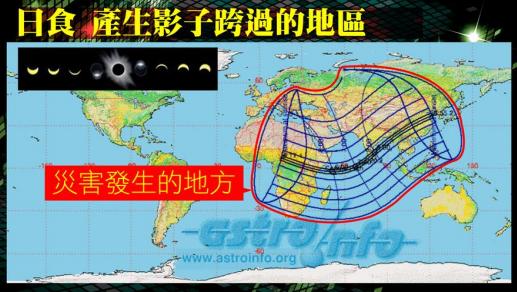 另外,日食的影子跨过的地区和旁边的地区,当看到日全食或日偏食,都会是灾害发生的地方。